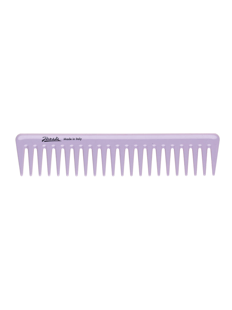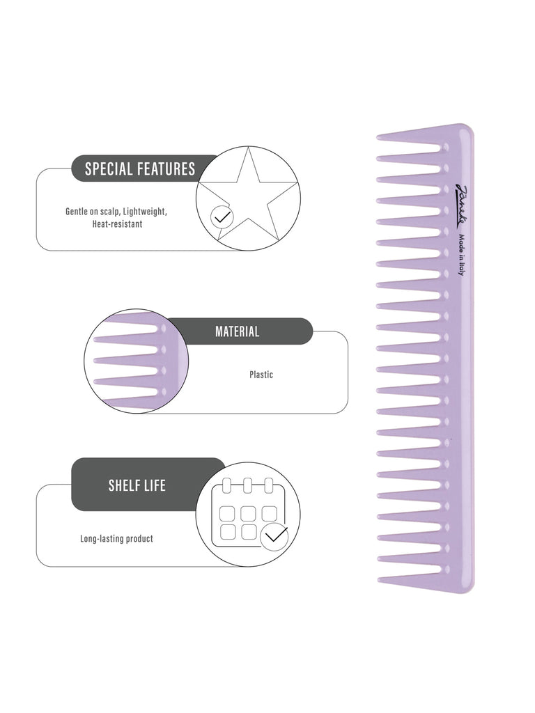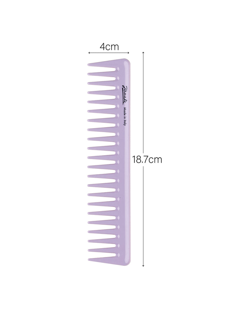 Professional wide-tooth comb in lilac fluo. Designed for gel or mask application and gentle detangling. Shockproof PMMA ensures strength, while rounded tips protect the scalp.