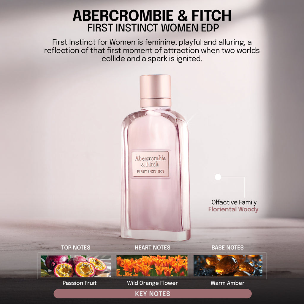 First Instinct for Women is a feminine, playful, and alluring combination of attractive floralcy and irresistible seduction, with a hint of freshness. The scent is composed of a sensual opening, a sparkling development, and an effortlessly seductive trail. Sun-kissed magnolia combined with a fruity zest gives a fresh yet sensual introduction. At the heart, Wild Orange Flower is blended with exotic Water Lily for a sparkling and feminine impression. With warm amber, creamy tonka, and addictive musk at its base, the scent is effortlessly irresistible, addictive, and deep. It is Abercrombie’s fragrant interpretation of that first moment of attraction, that first glance, when two people’s worlds collide and a spark is ignited. A memorable, captivating, and distinctive floral scent that speaks louder than words, blended for the woman who follows her first instinct.