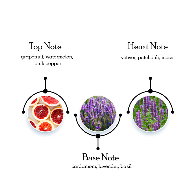 Top notes: grapefruit, watermelon, pink pepper; Heart note: cardamom, lavender, basil; Base notes: vetiver, patchouli, moss