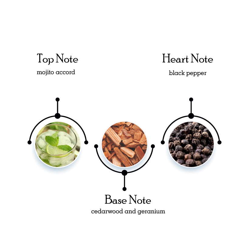Opening on a refreshing mojito accord, the fragrance immediately delights the senses. In the heart, a vibrant burst of black pepper, combined with the assertive masculinity of cedar wood and geranium.