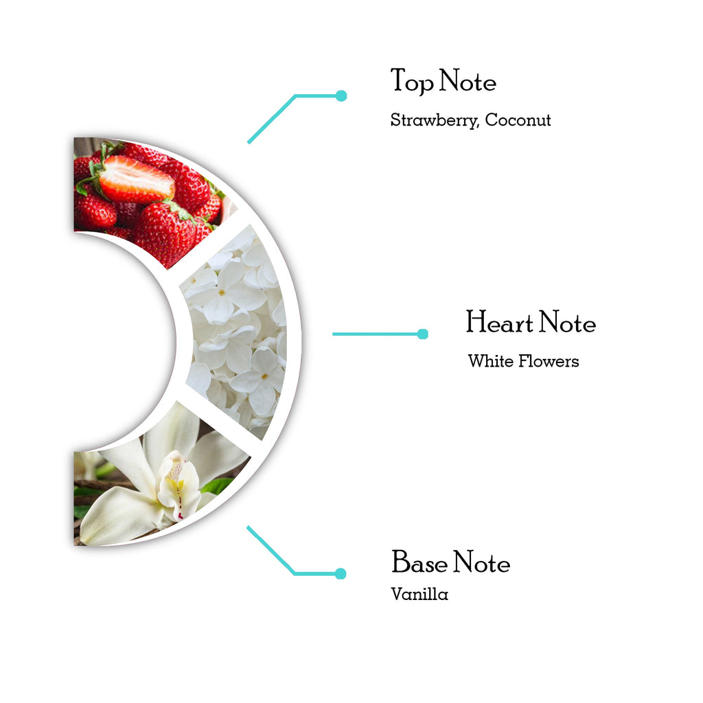 Top Notes: Strawberry, Coconut; Heart Notes: White Flowers; Base notes: Vanilla