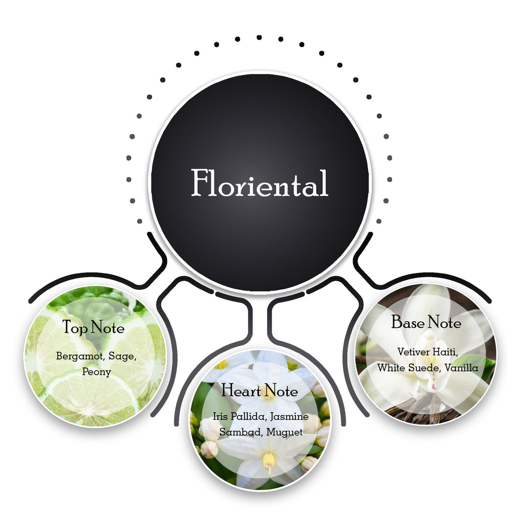 Top notes: Bergamot, Sage, Peony; Heart notes: Iris Pallida, Jasmine Sambad, Muguet; Base notes: Vetiver Haiti, White Suede, Vanilla;