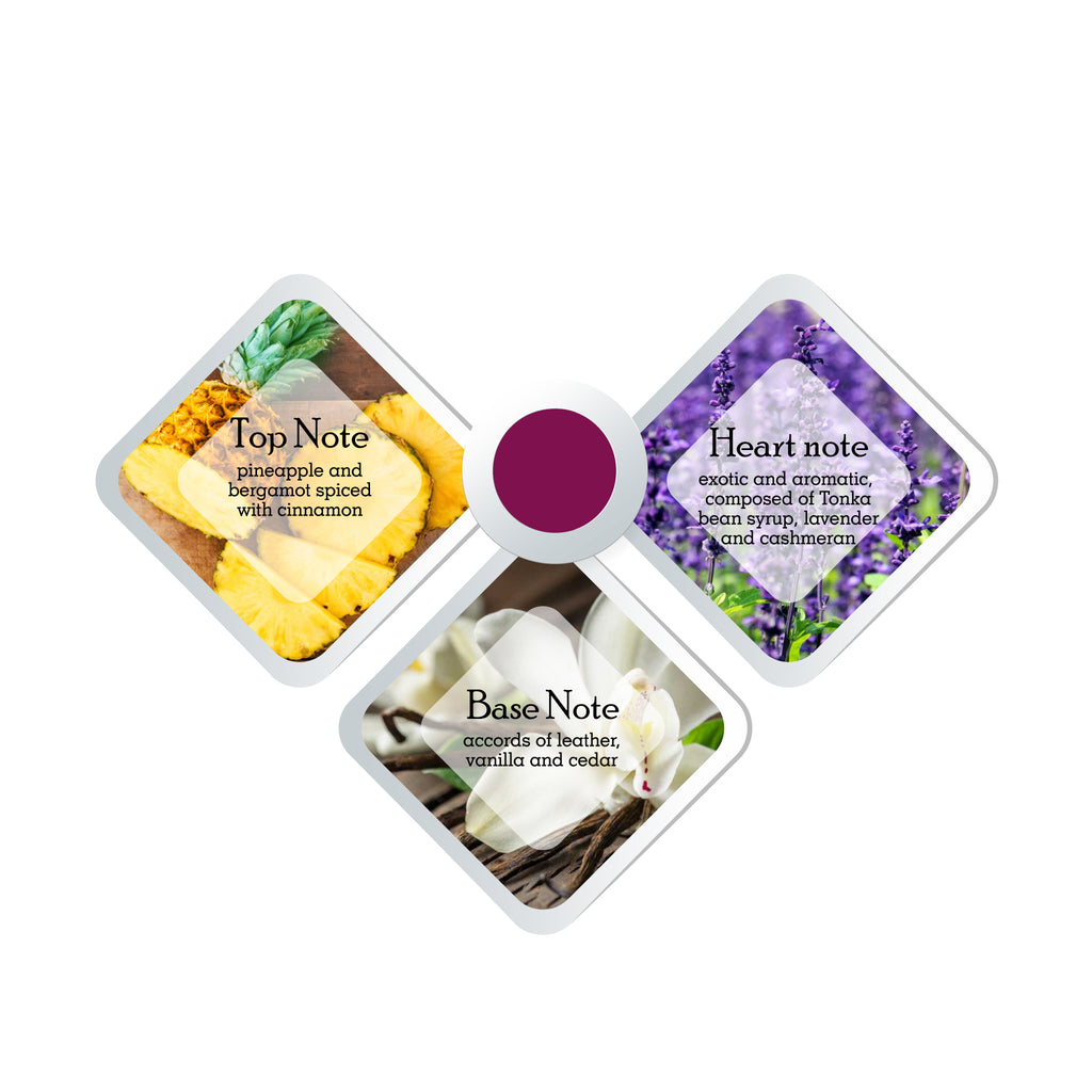 Playboy generation FOR HIM starts with energizing flavors of pineapple and bergamot spiced with cinnamon.