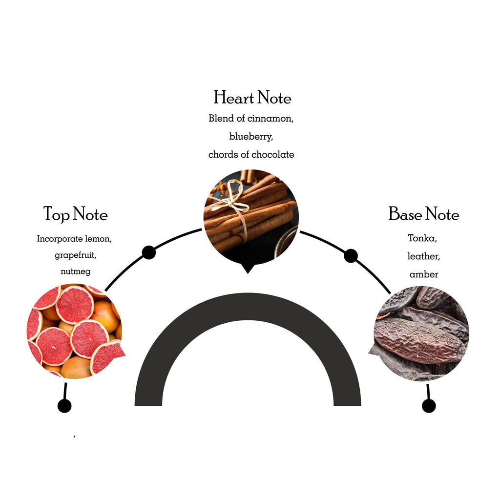 Top notes incorporate lemon, grapefruit and nutmeg; the heart introduces a blend of cinnamon, blueberry, chords of chocolate and pineapple, while the base develops tonka, leather and amber. .