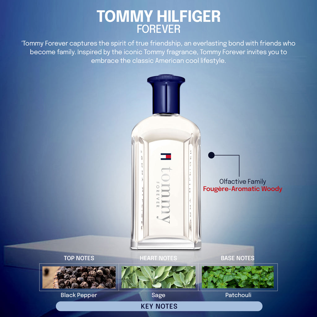 Tommy Forever captures the spirit of true friendship, an everlasting bond with friends who become family. Inspired by the iconic Tommy fragrance, Tommy Forever invites you to embrace the classic American cool lifestyle. Top notes of invigorating lemon facets with black pepper creates a bold freshness and a clean feeling. At its heart, Tommy forever embraces its Fougère signature, highlighted by a modern lavender trail. At last, a captivating patchouli note evolves into a warm woody note subtly enriched with salty clean woods and patchouli creating a rich skin-like feel. Discover Tommy Forever eau de toilette, an icon that lasts Forever.