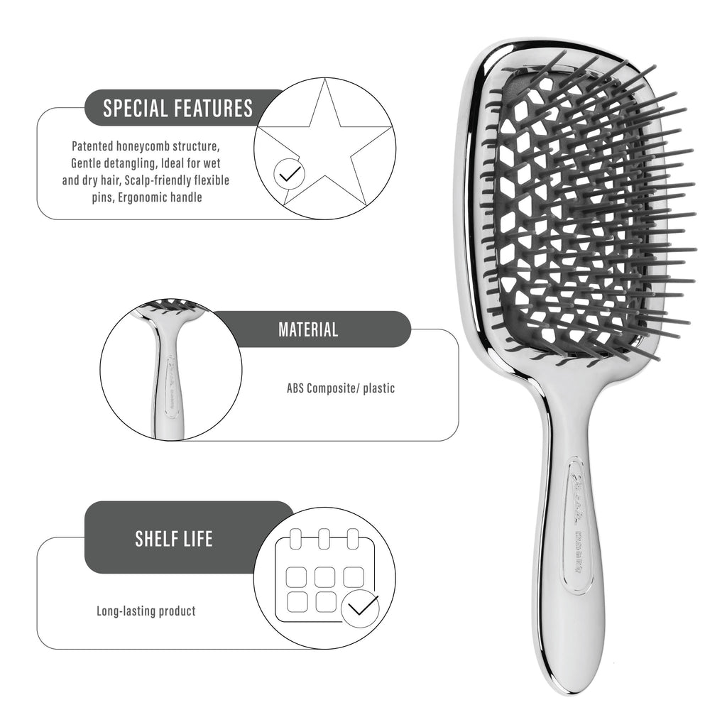 Patented honeycomb structure, Gentle detangling, Ideal for wet and dry hair, Scalp-friendly flexible pins, Ergonomic handle