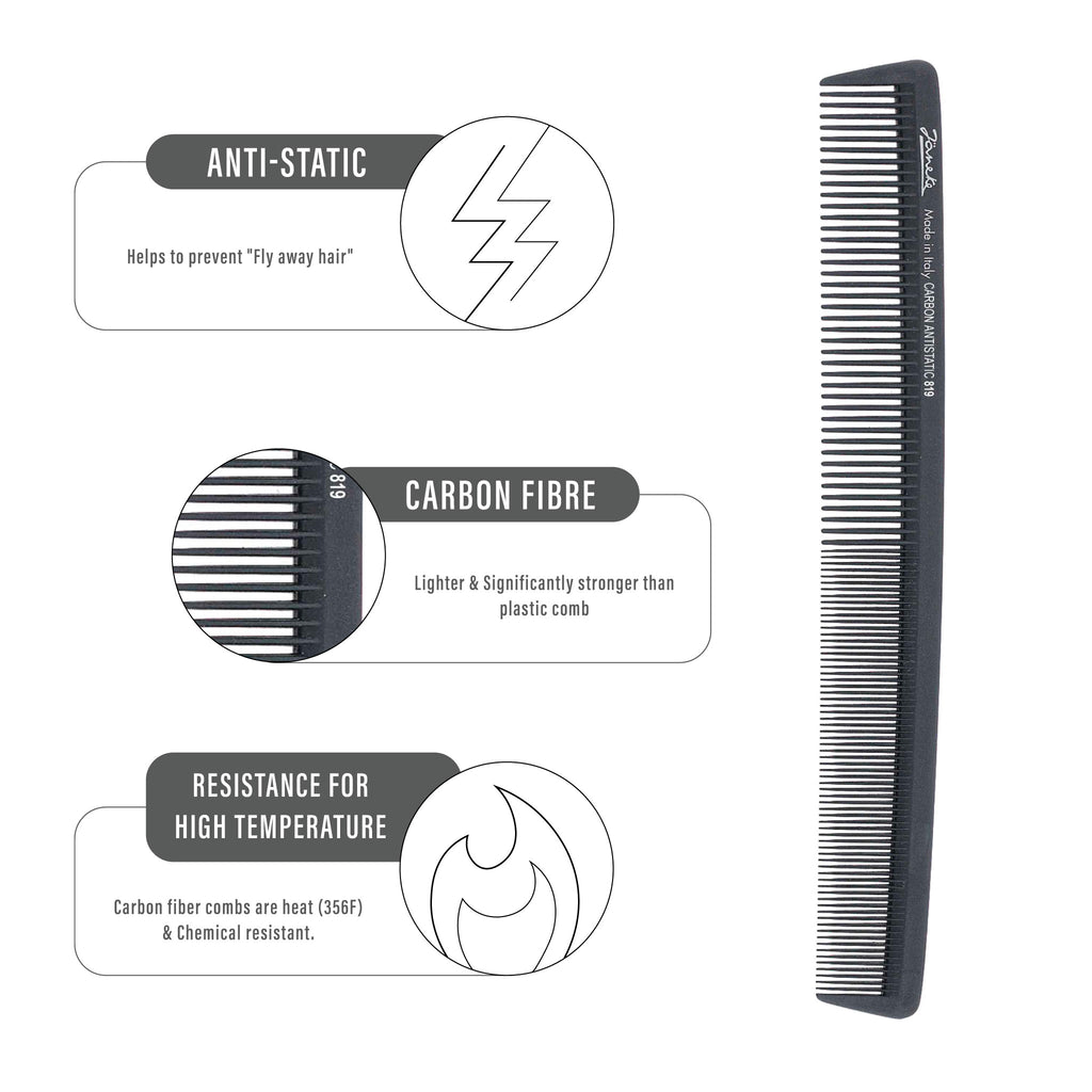 Carbon fibre -unique this is the characteristic that makes the brushes and combs of the product range truly anti-static for performance and strength, resistance to high temperature to chemical resistant for performance and strength, resistance to high temperature to chemical resistant.This combsare designed for intensive professional use and have rounded teeth that prevent the hair form being pulled and broken. Wide and fine teeth waving comb 22,3 cm Material: CARBON ANTISTATIC ( PA6 )